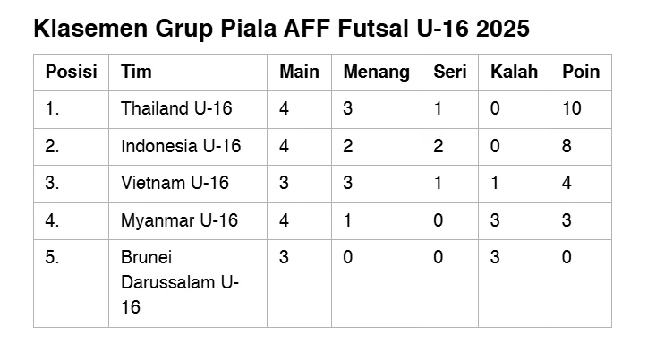 Timnas Futsal Indonesia U-16 menuntaskan fase grup Piala AFF Futsal 2025 tanpa menelan kekalahan dan memastikan tiket ke partai final. Berikut posisi akhir klasemen grup setelah laga Indonesia menghadapi Thailand.