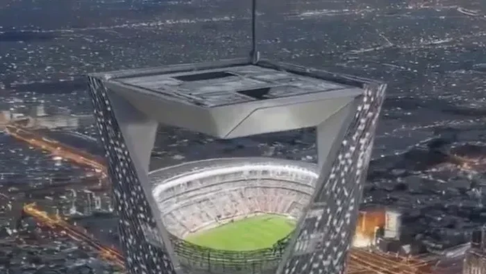 Ini tangkapan layar 'stadion langit' yang sedang viral. Stadion itu dinarasikan berada 350 meter di atas tanah dan akan dibangun di kota Neom. Foto: dok. Internet/X (Twitter) @ImpactMediaFR
